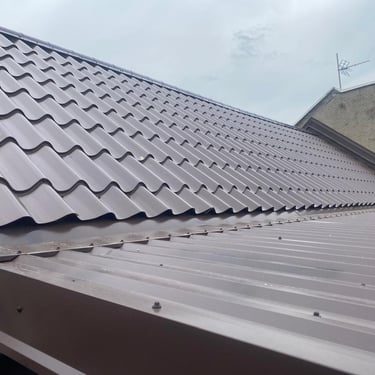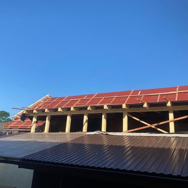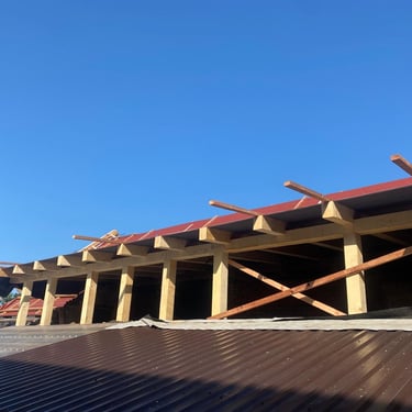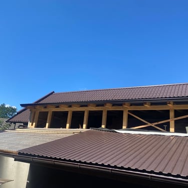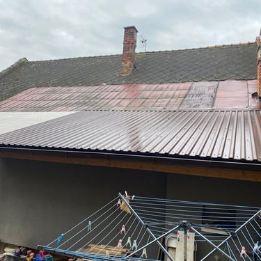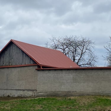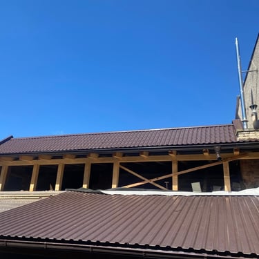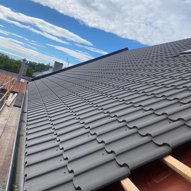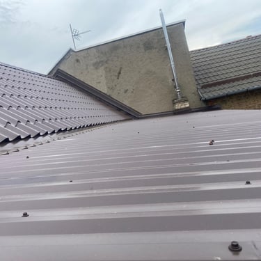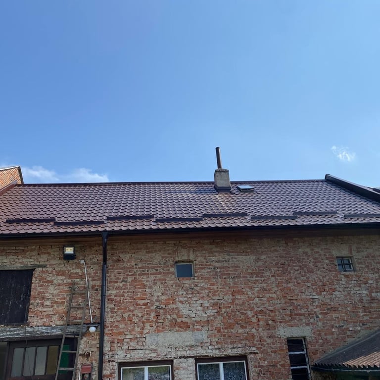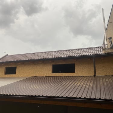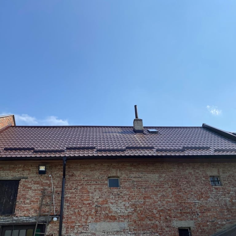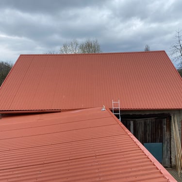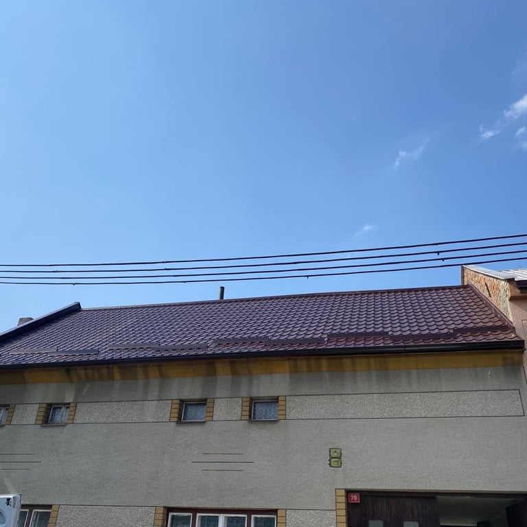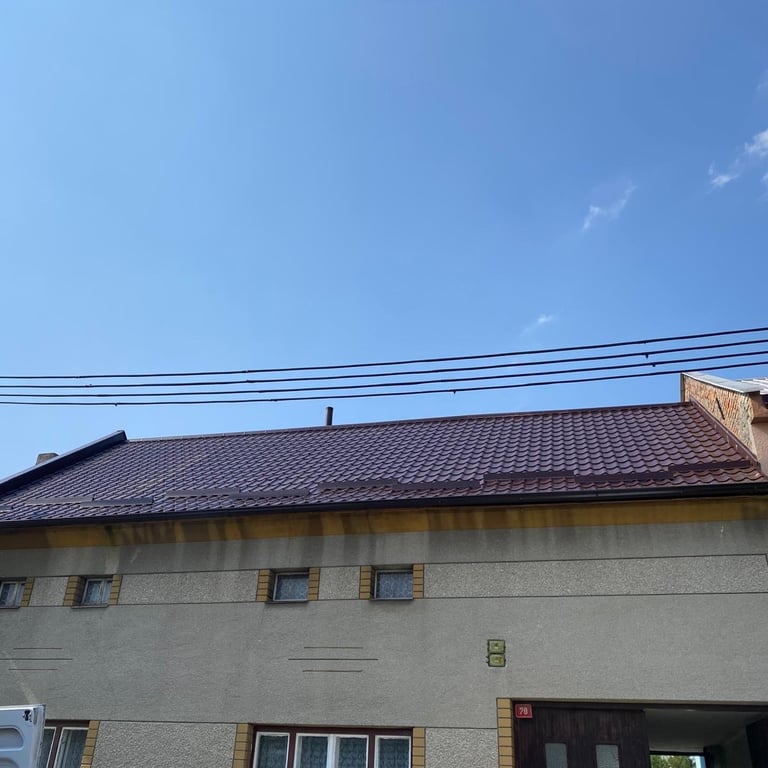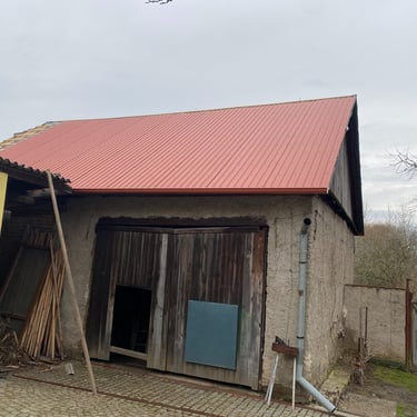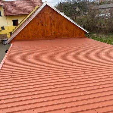 Původní krytina Onduline, nová krytina Ruukki Adamante 50+, vyrovnání komplet celé střechy, vybetonovaní a oplechování atik, komplet oplechování komínů.