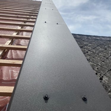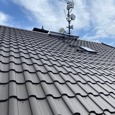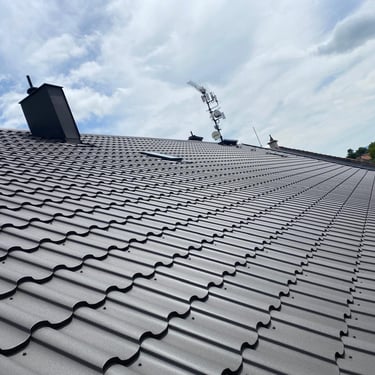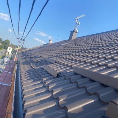 Původní krytina betonová taška, nová krytina Ruukki Monterey 40+, vyrovnání komplet celé střechy, vybetonovaní atik.